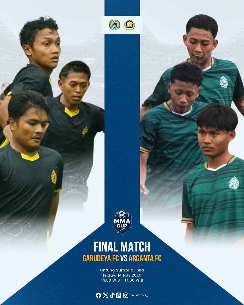 Dengan semangat sportivitas dan kebersamaan yang menjadi ciri khas turnamen ini, laga antara Garudeya FC vs Arganta FC dipastikan menjadi penutup manis bagi rangkaian MMA Cup 2025. Siapakah yang akan mengangkat trofi juara tahun ini? Semua mata akan tertuju pada Lapangan Untung Suropati, tempat sejarah baru akan tercipta. (Fatih)